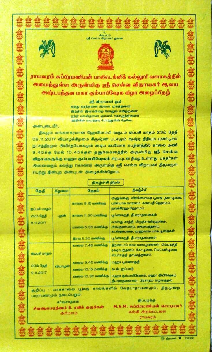 Selva Vinayagar Temple Kumbabishekam Invite
